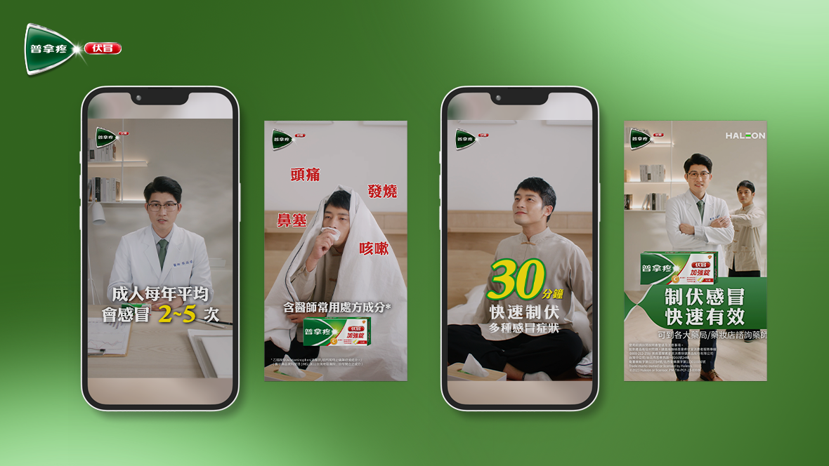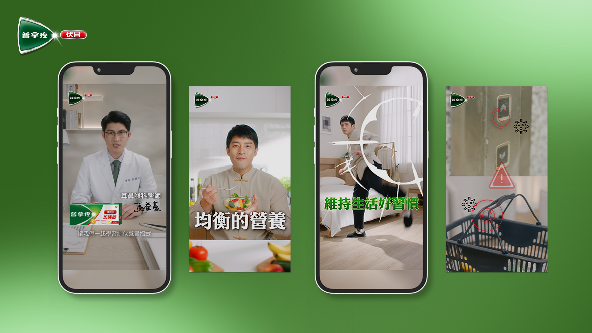 醫師專業衛教內容&趣味短影音,生動演繹「制伏感冒快又有效」訴求!有別於過往常見的衛教影片形式,以「醫師專業解說」搭配「具象功夫比喻」,演繹普拿疼伏冒能強效「制伏感冒病毒」的產品訴求,並以符合時下收視趨勢的短秒直式影音格式、明快的節奏,傳遞感冒處理的衛教知識&伏冒加強錠強效的產品力與品牌印象。