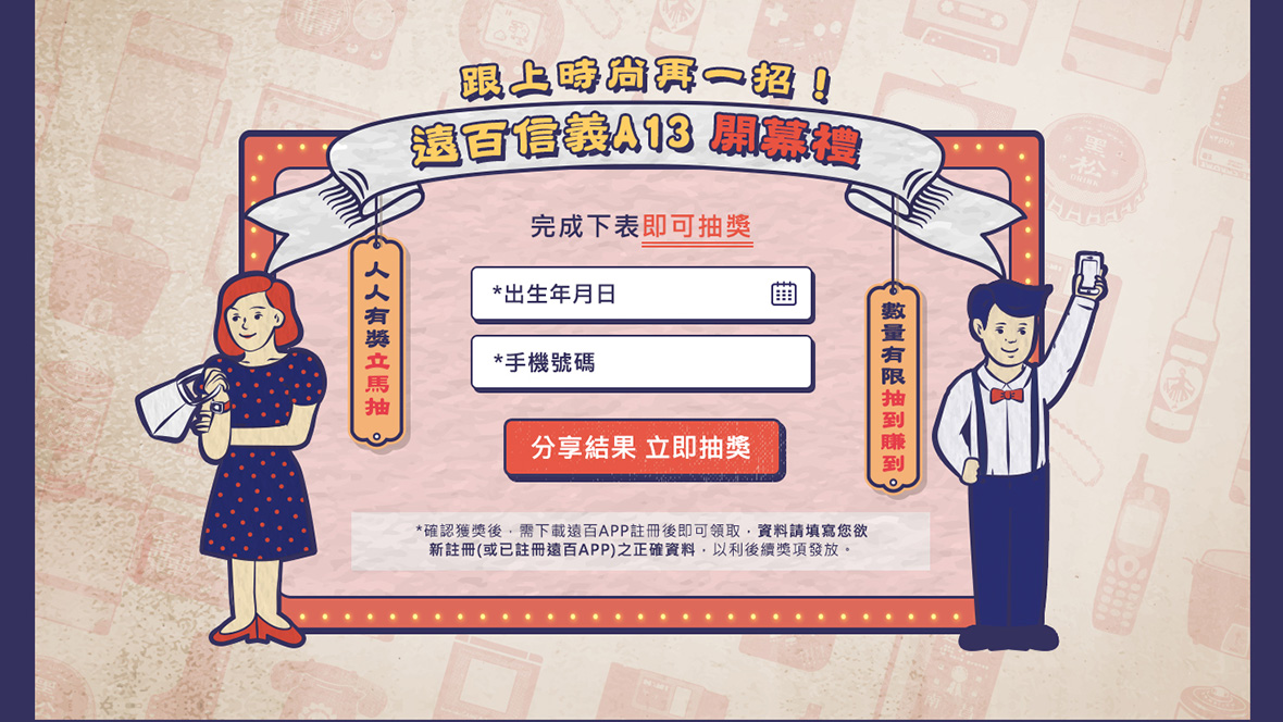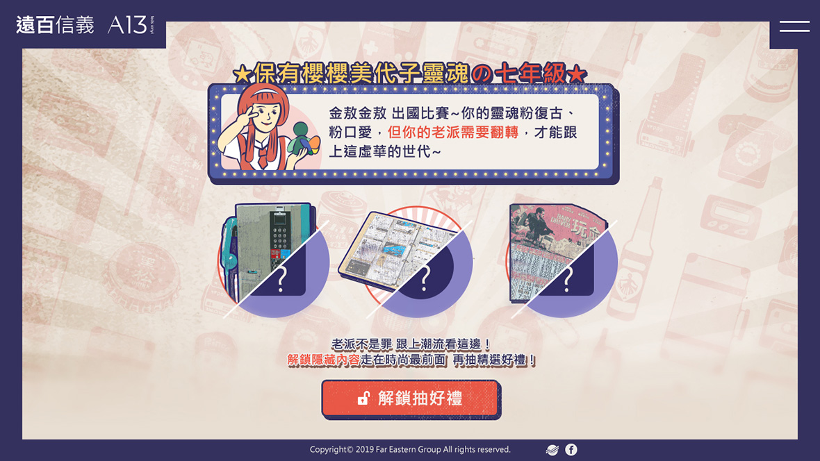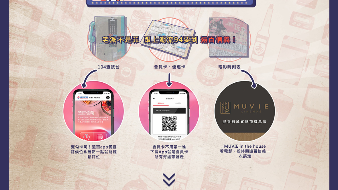 遠東信義 你的老派好不浪漫只要輸入你的出生年份,一鍵把你送回你最懷念的青春時光,選出你回憶中的最酷、最炫、最潮的經典,看看你的老派屬於哪一派,到遠百信義A13可以怎麼玩!橫跨多個世代,不管你是幾年級,都能讓你一秒回想起那個美好的年代!