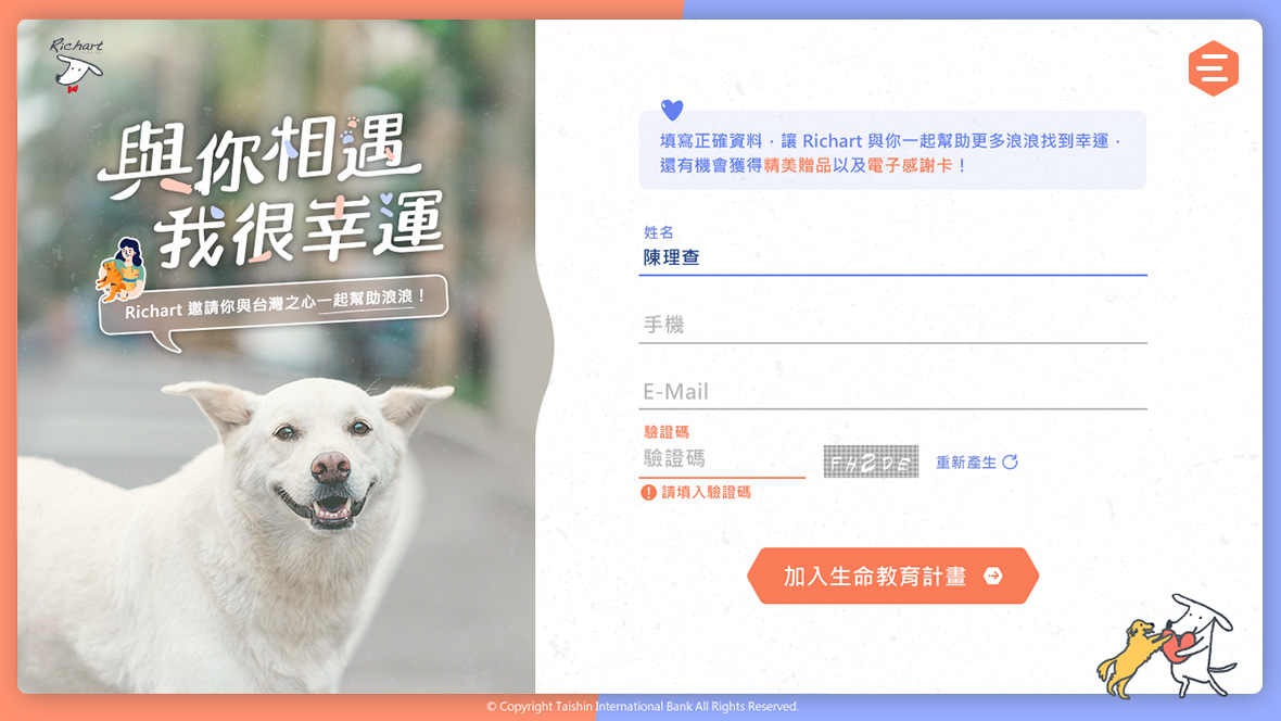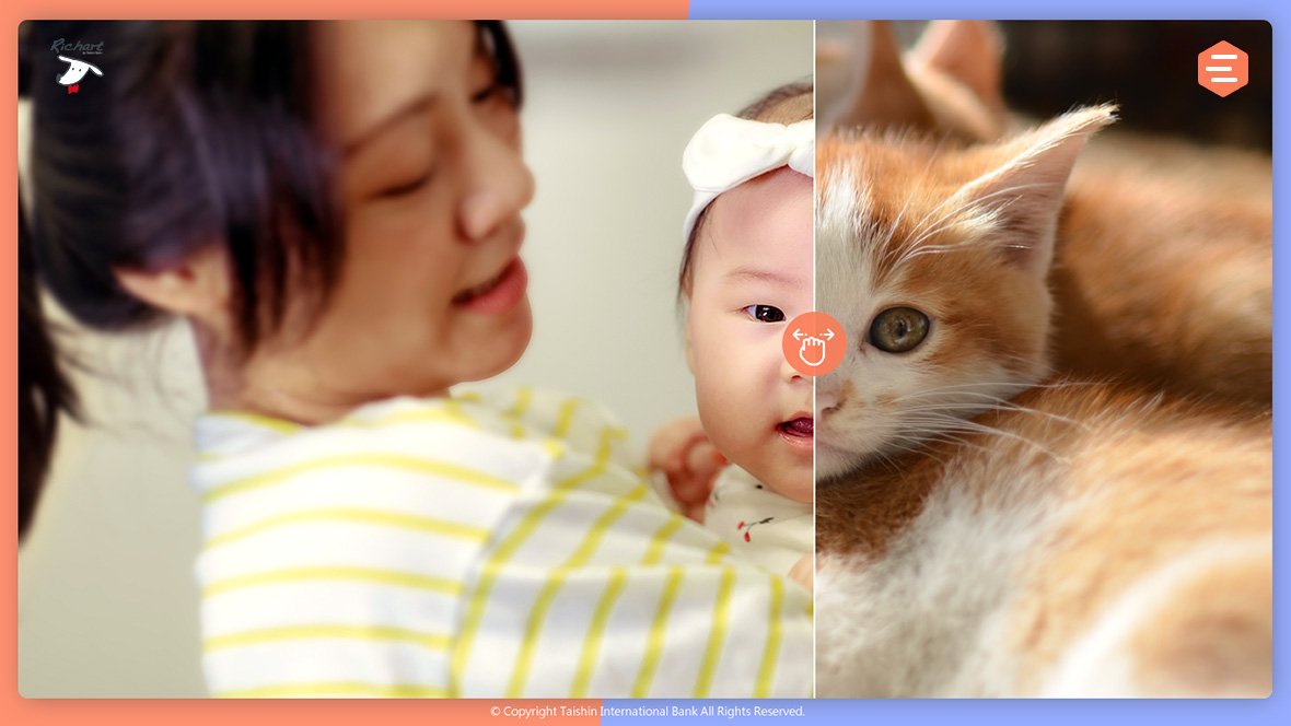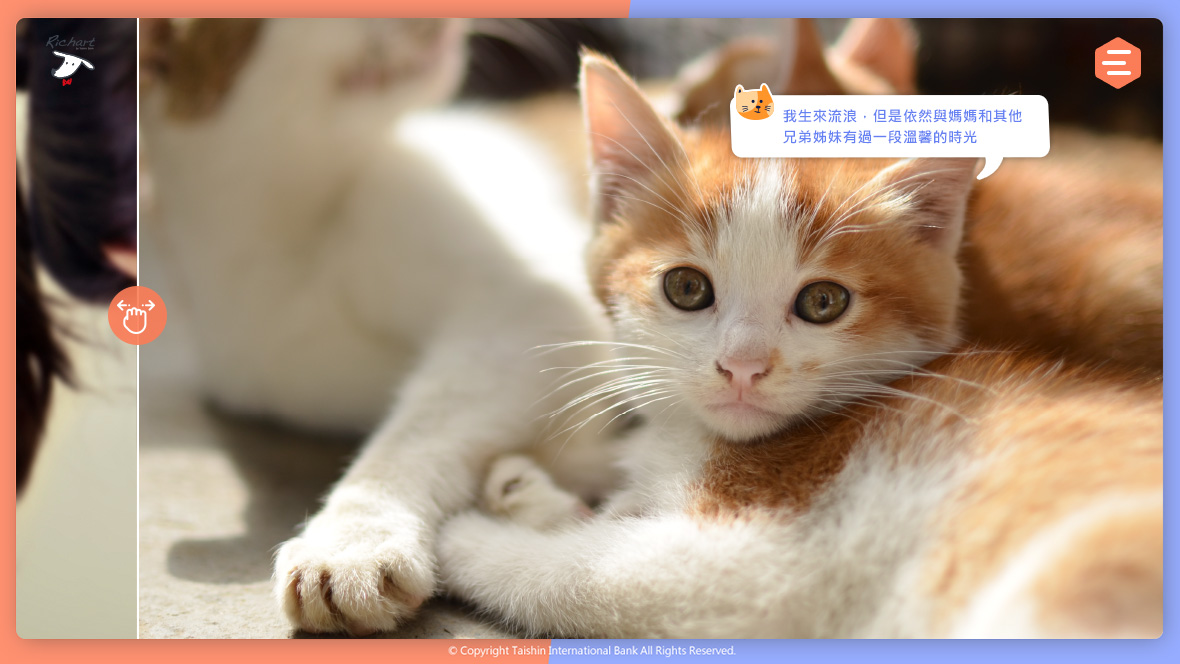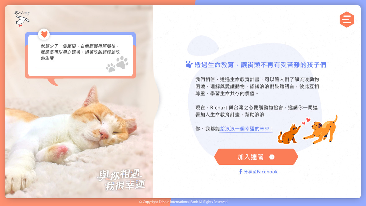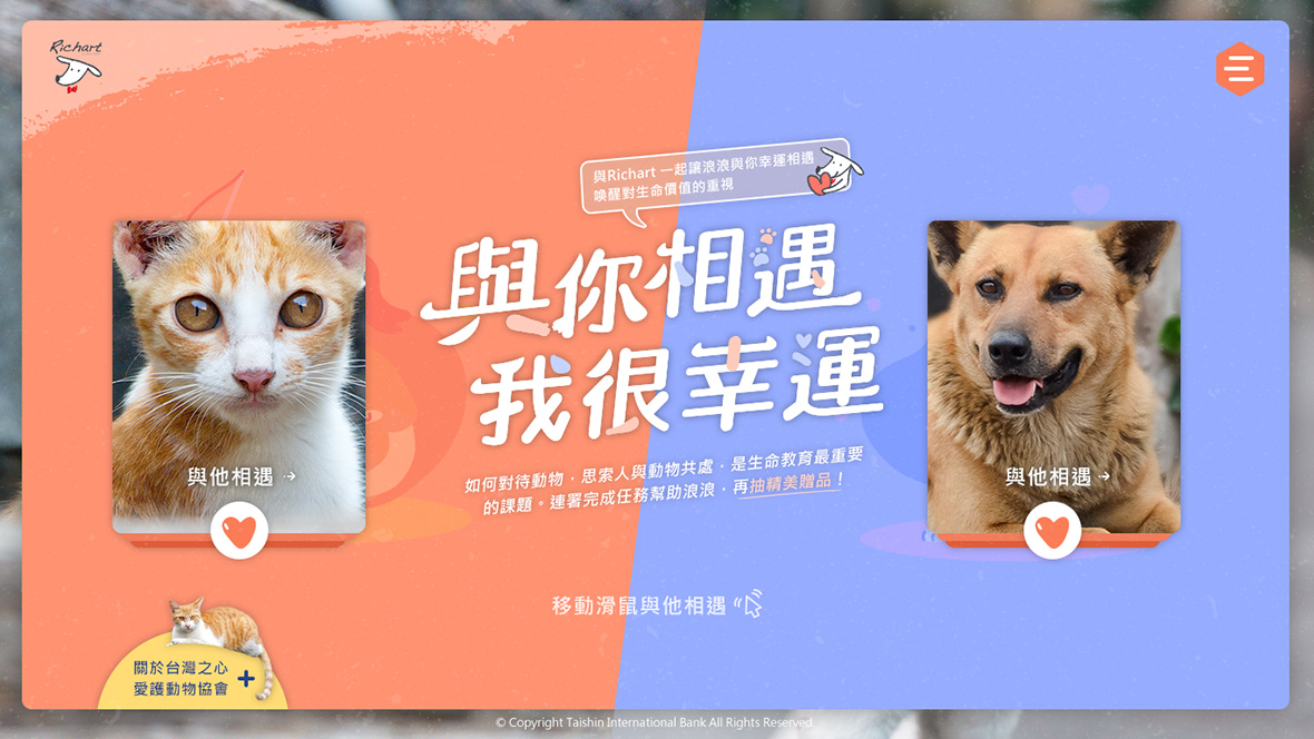 Richart 浪浪活動來到第五屆,回到浪浪議題的源頭:生命教育議題。尊重生命,是一個社會文明進步的展現! 這次以與浪浪相遇、看他的故事為主題,在首頁上使用了類似交友軟體介面框的小巧思來增加相遇的概念。網站主要配色也使用活潑鮮明的亮橘、藍紫色透過撞色設計加深視覺吸睛度。 我們相信,透過生命教育,能夠讓人們尊重其他生命,只要持續下去,有一天可以終結街頭受苦受難的浪浪們。透過人類與流浪貓狗的故事對比,會互動的過程中同時生命的差異性與同質性互相對照,讓使用者產生同情心,並同步理解台灣之心愛護動物的理念與 Richart 的任務詳情,邀請使用者一起更加了解生命教育的意義,幫助浪浪從你我做起!