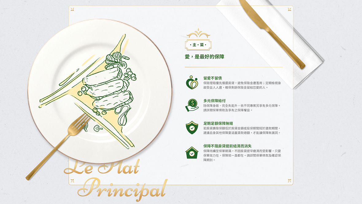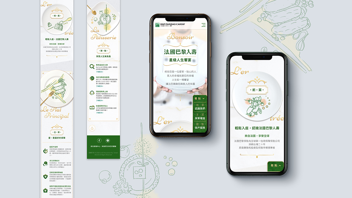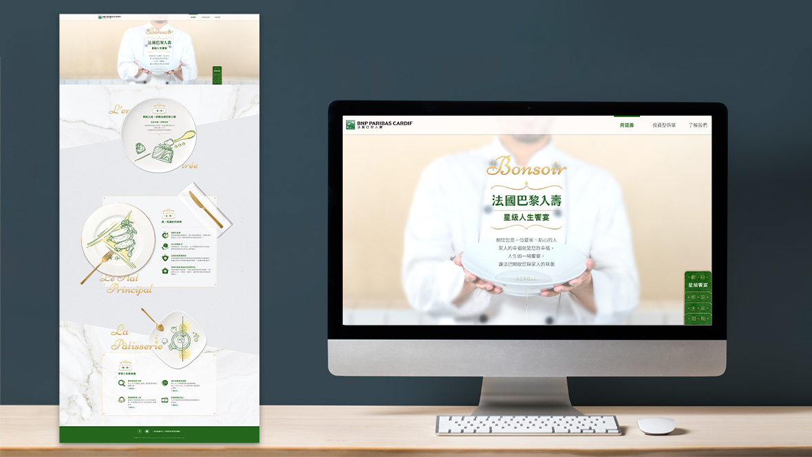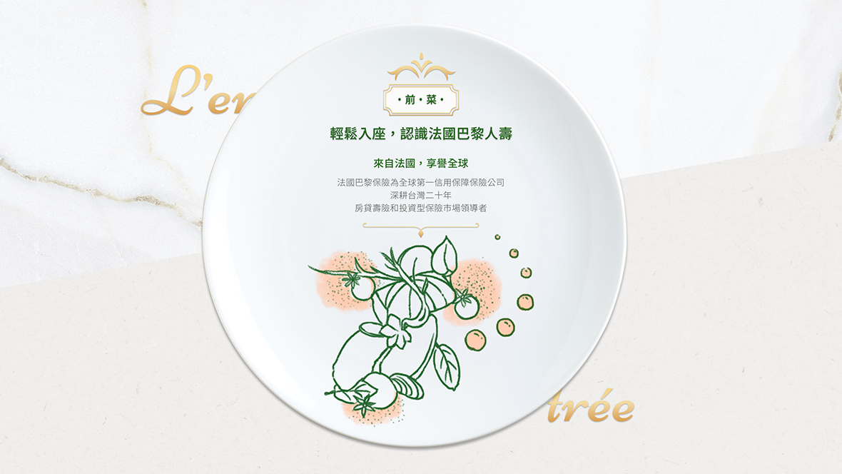 人生饗宴,從好的保障開始。以星級餐廳包裝,讓保戶感受體貼的服務。透過星級餐廳將品牌包裝做聯想,結合保險資訊,讓保戶在保險後可以輕鬆、順利理解保單性質與風險,同時也是歡迎保戶透過法國巴黎人壽的保單服務,開始享受人生饗宴。 有鑒於壽險的資訊內容較生硬,所以我們發揮創意,用法國米其林星級餐廳禮儀來包裝視覺主軸,情境式的引導使用者更輕鬆的瀏覽內容。 網站開場為逐格短影片,帶位人員引導歡迎入場,接著場景變成廚師擺盤帶出壽險文字重點。