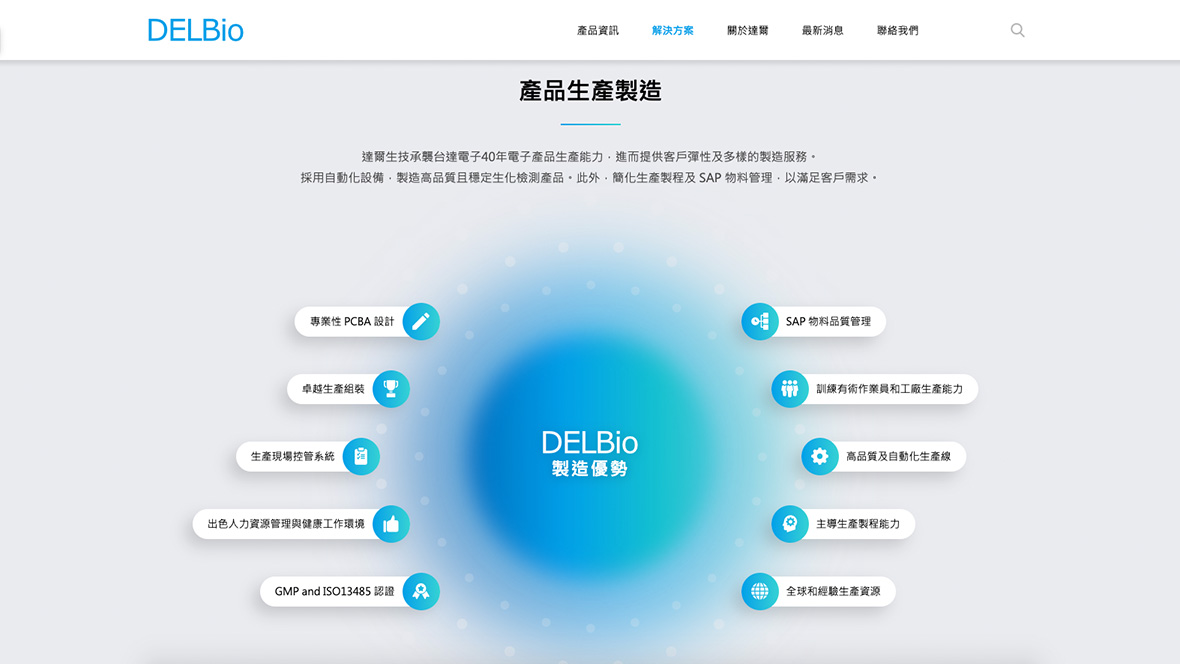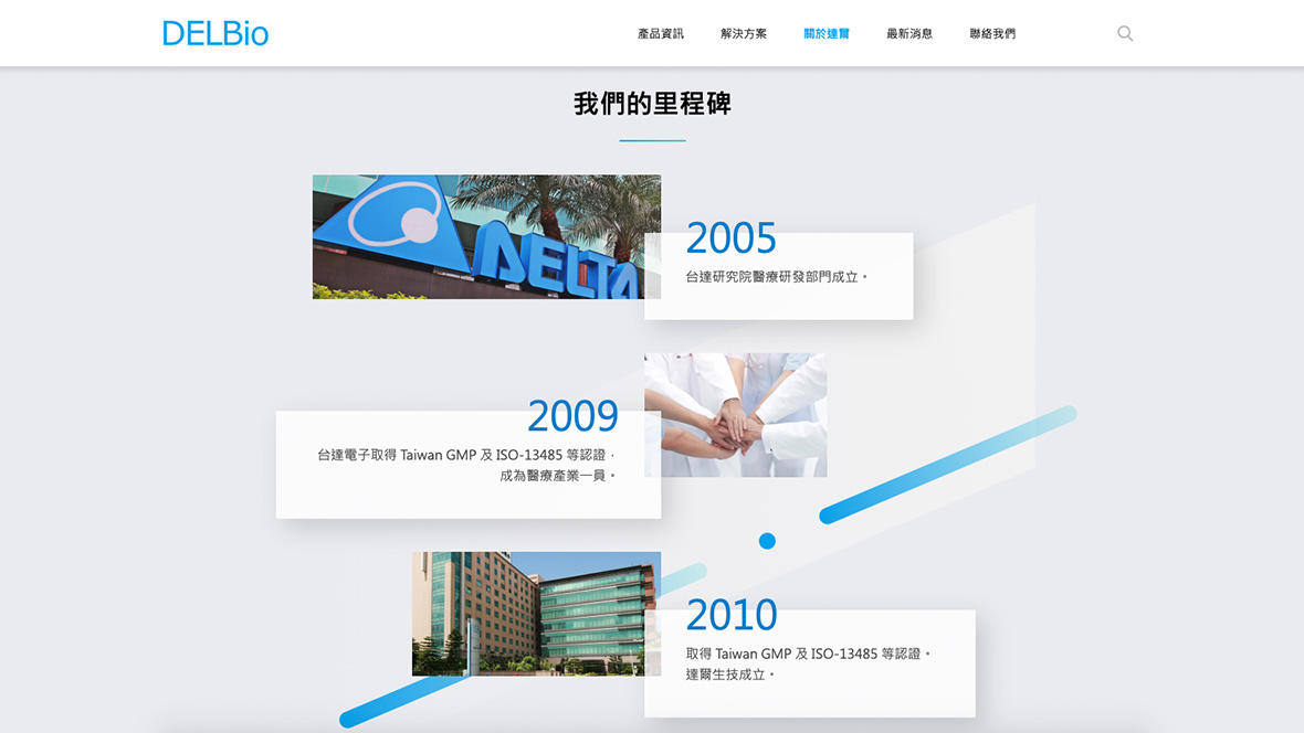 台達電子旗下的醫療器材品牌,DELBio官網遇到了幾個問題 : 1.網站內容後台更新不易 2.網頁設計過時,譬如文字太小、圖片太小、嚴重不符合現在的使用者瀏覽習慣 3.手機裝置上的瀏覽體驗不良 4.網站整體的資訊架構混亂,資訊找尋不易 5.產品內容說明不夠清楚。 我們利用這次的改版機會,重新調整了網站架構,讓資訊的瀏覽動線很清楚。全站也都利用響應式網頁技術開發,讓所有裝置上都可以得到最舒服的瀏覽體驗,調整產品說明的呈現方式,讓消費者可以更輕鬆的了解達爾生技設計開發及製造能力的優勢。