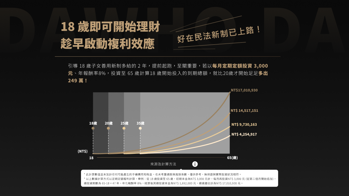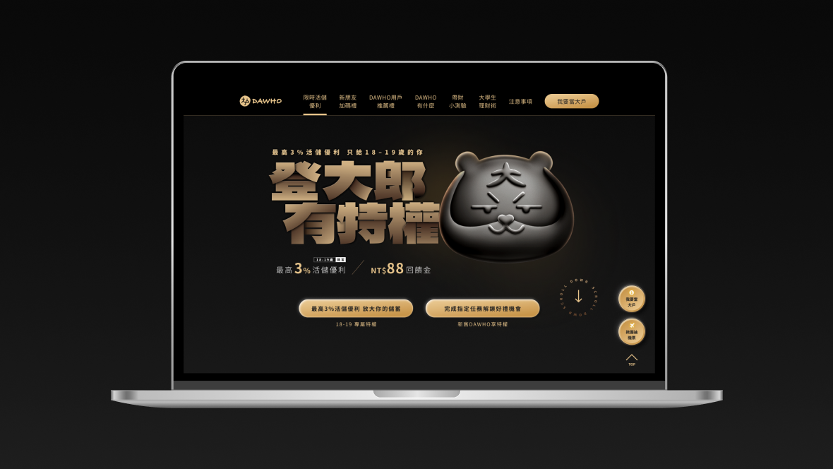 18歲登大郎!永豐DAWHO送上成年禮:受用一生的理財全攻略登大郎才有的特權!永豐DAWHO挖掘成年時刻的細膩洞察,並以時下年輕人有感的系列短影音形式,以及逗趣的表現風格,搭配活動網頁心理測驗、大學生理財白皮書等多元操作,全方位溝通登大郎專享好康,同時提升年輕族群的金融素養,更奠定了DAWHO在消費者心目中的品牌魅力!