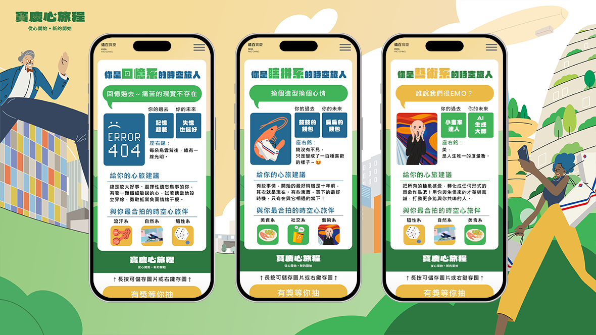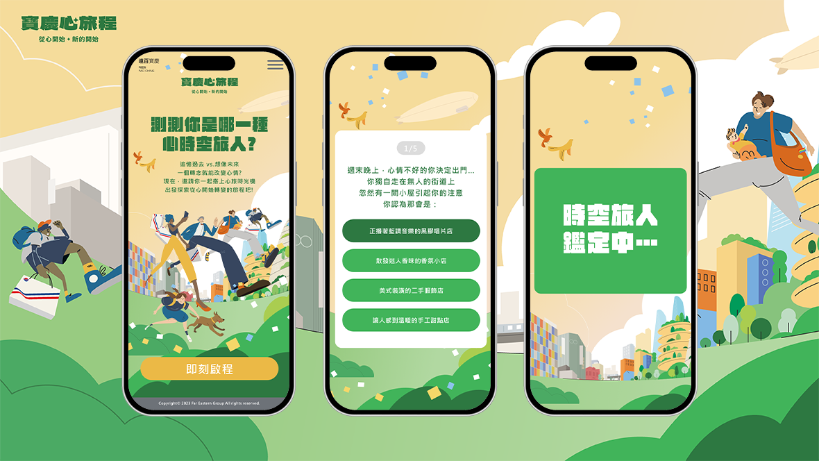 遠百寶慶店改建出清 ! 歡迎各位旅人搭上心旅時光機,一起來探索心旅程全台既存歷史最久的百貨遠百寶慶店,原址重建再出發!我們透過沈浸式故事的心理測驗,一步一步帶領消費者進入時空之旅,並透過測驗結果搭配抽獎互動,串接線下引導人流進店,O2O完整體驗,有效帶動消費者,親眼見證老字號百貨改建前的最後風華。