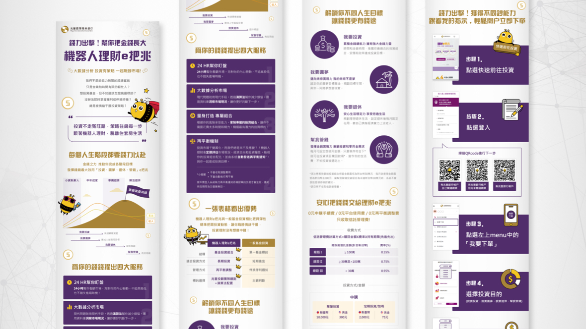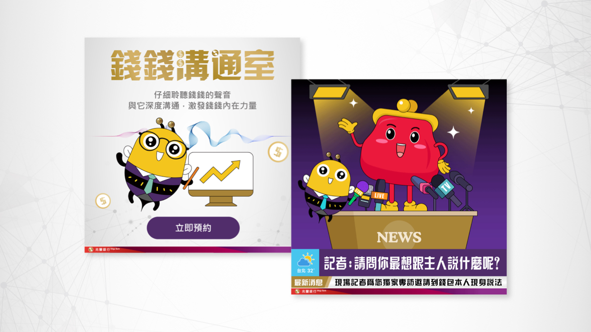 結合時下熱門話題,『溝通師』+『Ai 智能』概念,創造出一場與財富的靈魂對談!只要打開手機鏡頭對準你的錢包,兆豐幫你翻譯出你的錢錢想對你說什麼!將抽象的金融商品服務流程具象化,顛覆金融商品的溝通方式。 熱門話題包裝,驚喜拉近金融商品與消費者的距離!結合時下熱門話題『溝通術』與『CatGPT』概念,讓對於財富的未知想像得到趣味幽默的註解,並且透過對話互動方式,傳達出智能理財的特性,藉此降低理解門檻,體貼友善所有投資理財的族群!