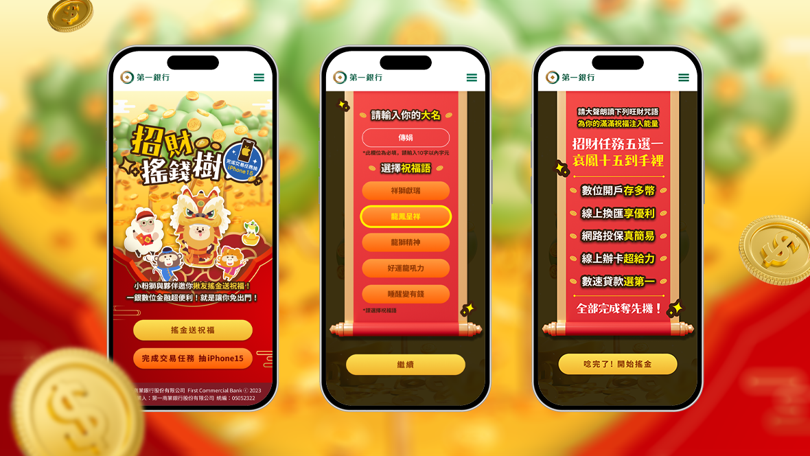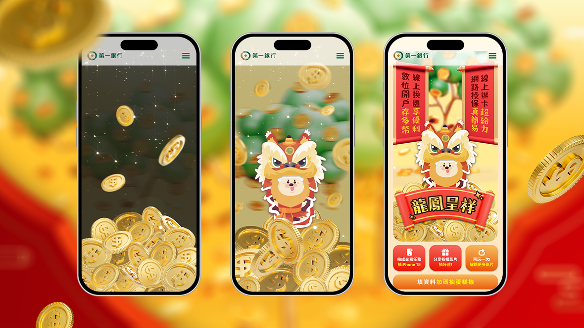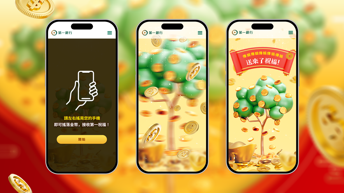 跟著小粉獅與朋友們,搖出一整年的旺財祝福! 入圍LINE Biz Awards - 最佳創意內容運用獎:透過簡單直觀的「搖錢樹」&一銀最具代表性的小粉獅,帶給消費者最可愛的數位拜年利器!運用手機陀螺儀搖落金幣,即可獲得充滿年味的數位賀年卡,招財感十足的視覺動態與互動,打造金龍年最夯的年節娛樂體驗!