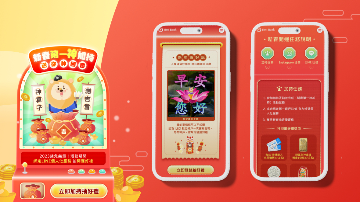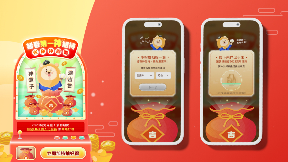 結合籤詩與遊戲機台介面,老中青都愛的預設運勢,放上你的大拇指,指紋辨識出你的新年好運撇步!趣味梗圖無痛包裝金融服務,趣味互動增加擴散廣度,創造傳散話題! 主視覺以神算遊戲機為概念。輸入出生日期加上指紋辨識,小粉獅化身古代「神算子」發送好話錦囊、測開運吉言,整體以偏橘的紅色為主色系,喜氣帶一點現代感。 神算子小粉獅於錦囊內探出,加入金元寶、錢幣等提升豐富度,並使用破格手法表現金幣飛出,使畫面更具空間張力。也以光影製造前後景,使畫面視覺更具層次感! 搭配進場動態提升整體活潑度,吸引使用者參與其中。