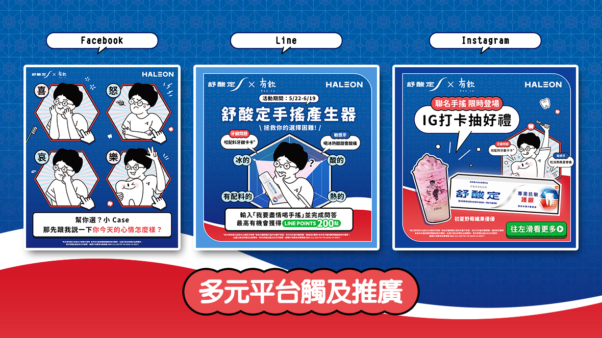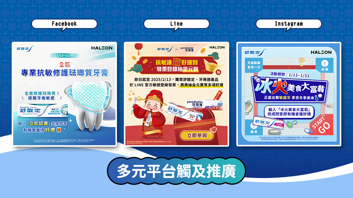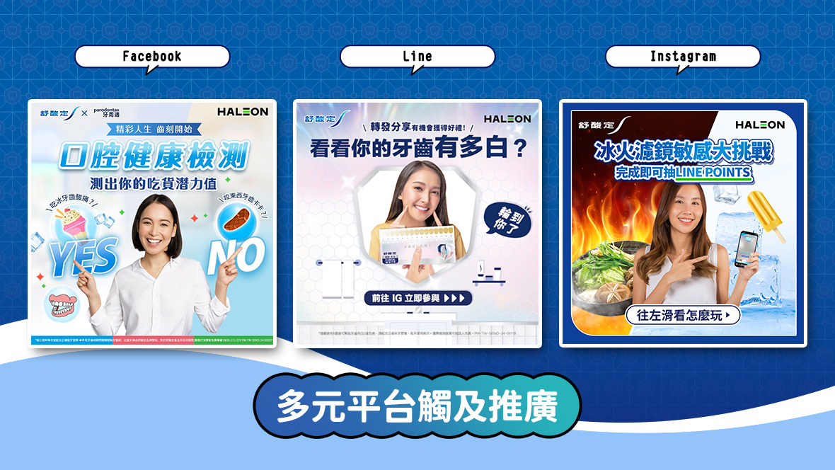 舒酸定社群平台營運策劃配合品牌產品宣傳檔期以常態且持續的商品推薦、衛教新知、與趣味互動行銷企劃、Chatbot 機器人對話等,提升帳號內的資訊豐富性,經營任務除了跨平台(Facebook、Instagram、LINE)的原生內容製作外,更與媒體、廣告、公關代理商多方合作,呈現多元且結合線上下的檔期操作,善用實體與數位的溝通助益,傳達品牌的溝通訊息