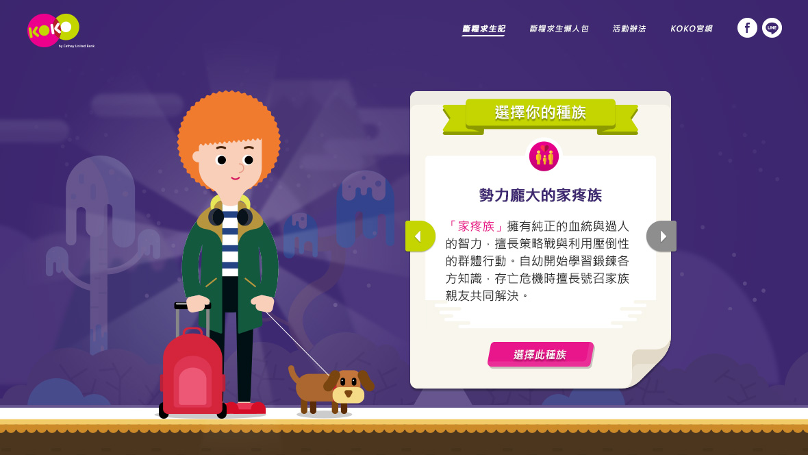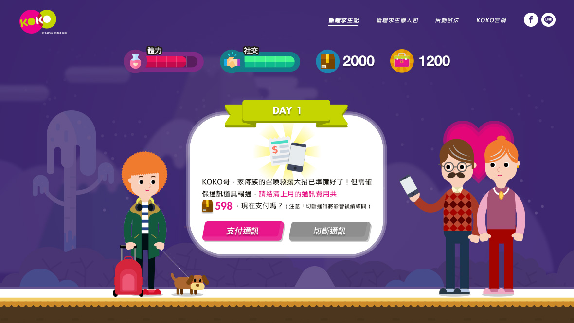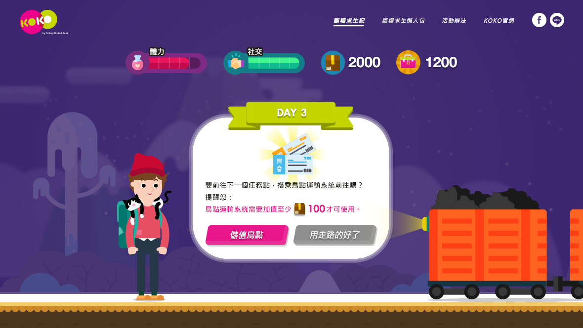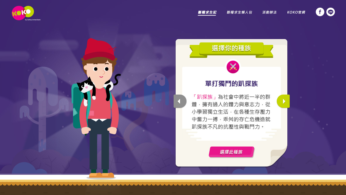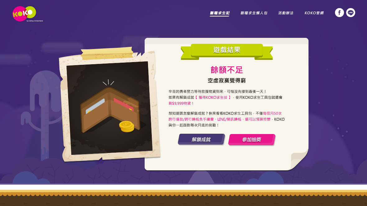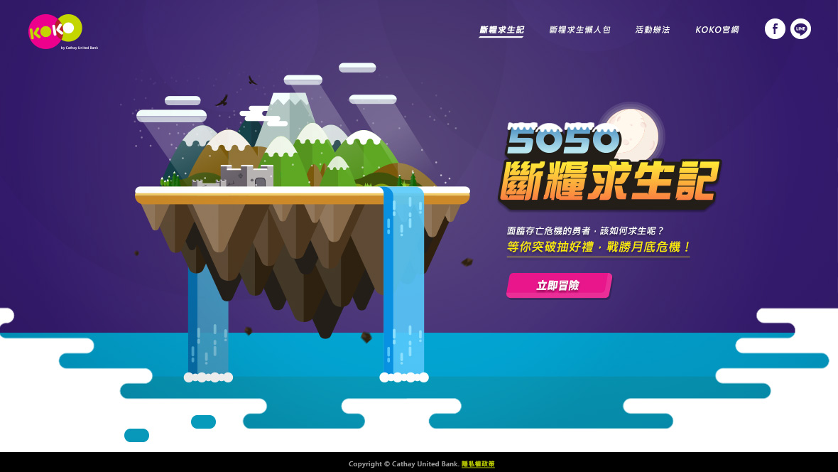 KOKO 5050 斷糧求生記月底吃土有解! 幫助KOKO數位帳戶與年輕族群溝通每個月50次轉帳免費的優惠,利用各種生活情境去凸顯「小錢」的價值。 我們觀察網友討論每個月吃土、斷糧等等的情境,以遊戲概念設計出各式關卡,在每次的選擇中潛移默化金錢的重要性,以及KOKO如何可以幫助用戶度過每月月底的吃土關卡。
