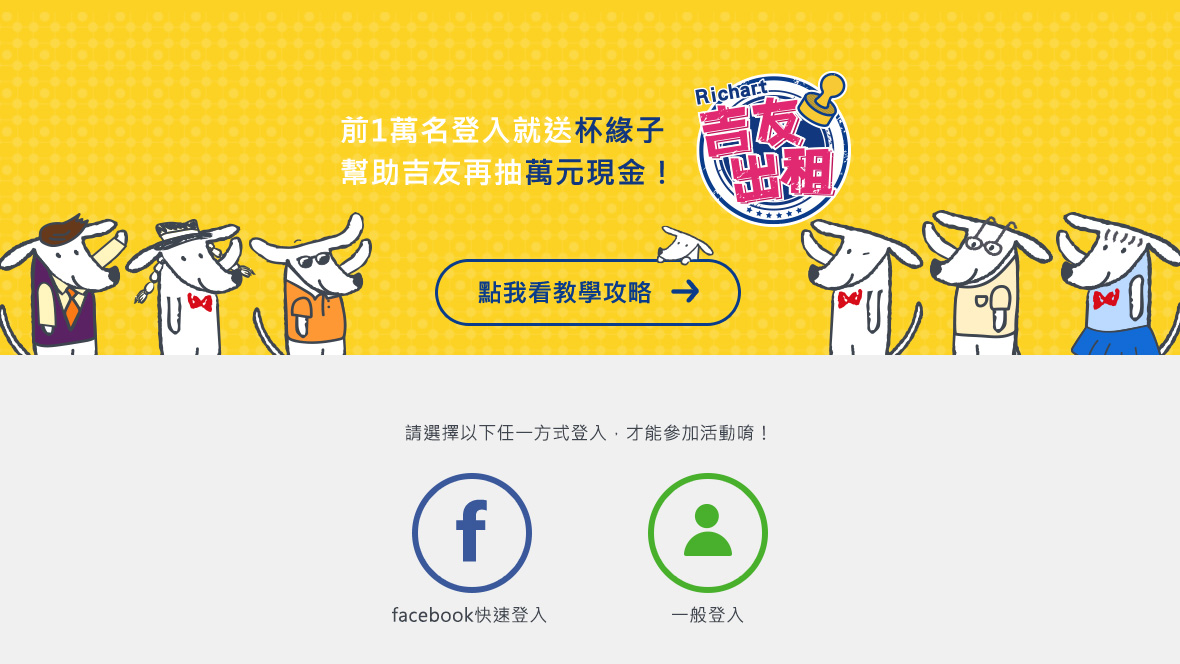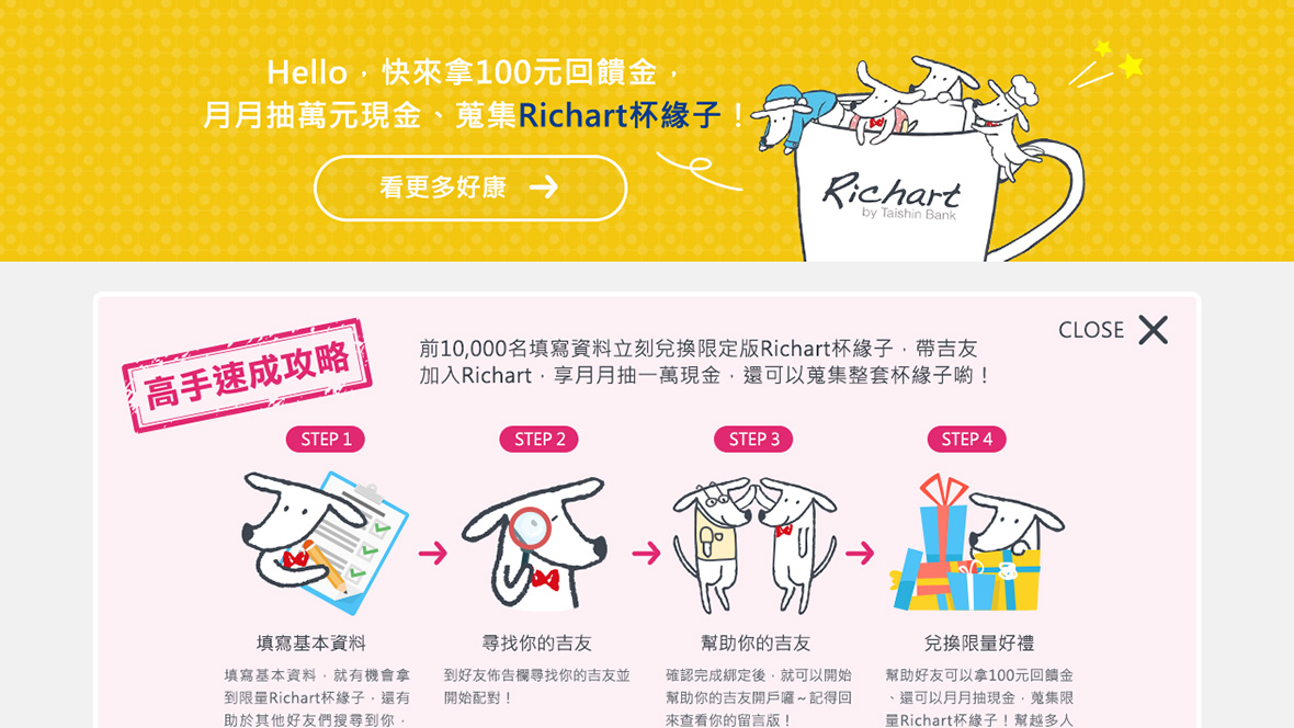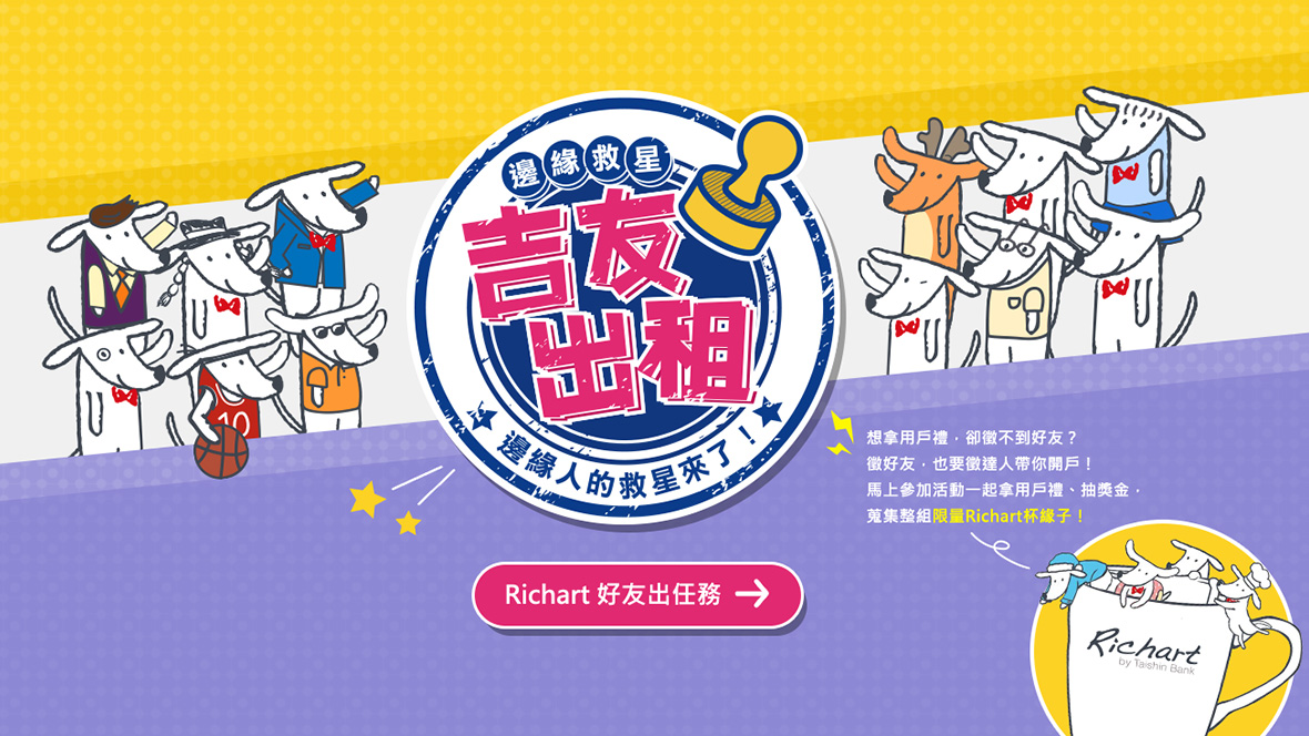 Richart 吉友出租前無古人!絕無僅有的金融交友平台! 交友軟體左滑又滑,邊緣人只能QAQ?Richart幫你打造全新金融交友活動,一起來吉友出租! 喬階開戶斷點、帶入時事議題,此次活動依然延續上次佳績,透過帶好友開戶的經驗累積讓用戶選擇配對對象,完成開戶即可兌換好禮。此活動自主口碑推薦、分享文不斷,帶來極佳的活動成效。