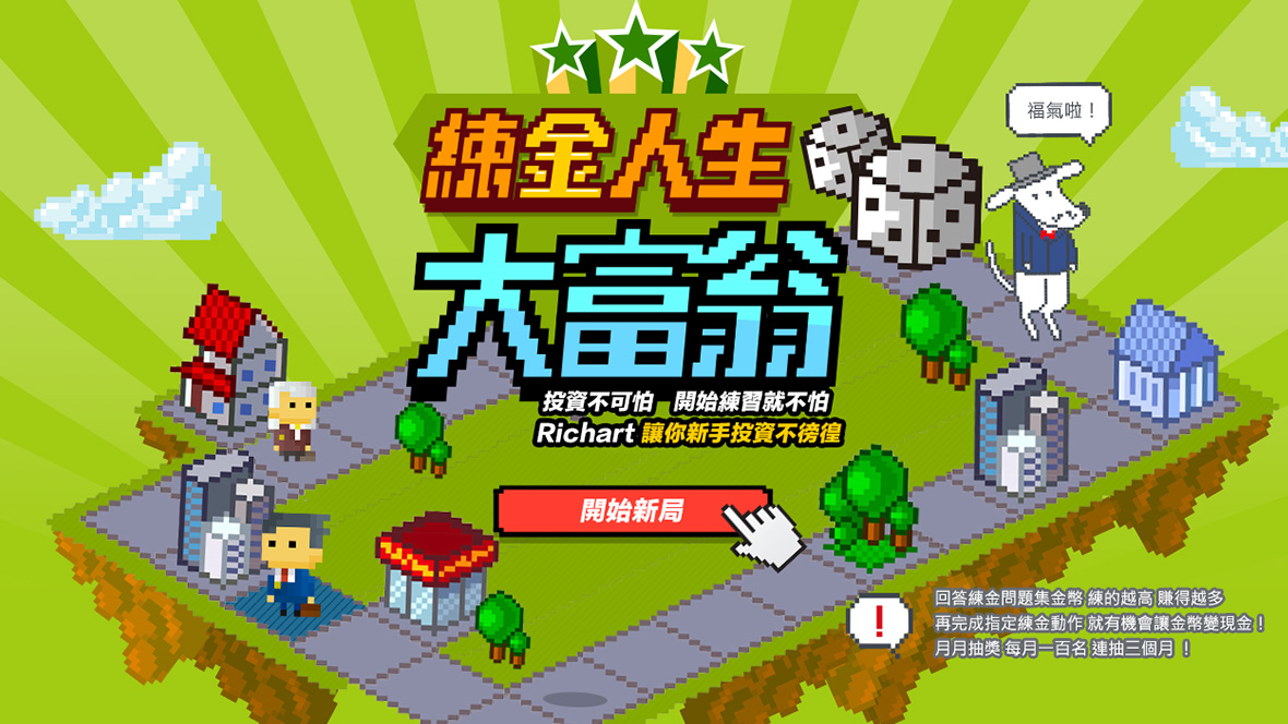 Richart 煉金人生大富翁在各家金融機構進行投資前,都必須填寫風險屬性評估的問券,評量用戶「基金投資有賺有賠」的概念是否明確。但問券形式過於冗長,時常造成投資新手不耐而跳出。 我們利用經典大富翁的網頁遊戲,轉化風險屬性問券成有趣的發問,每一步還讓你感受到不積極練習投資帶來的小麻煩,每個問題還能累積虛擬金幣,完成遊戲不只了解風險評估的重要,按照步驟練習投資還有機會把虛擬金幣變成現金!