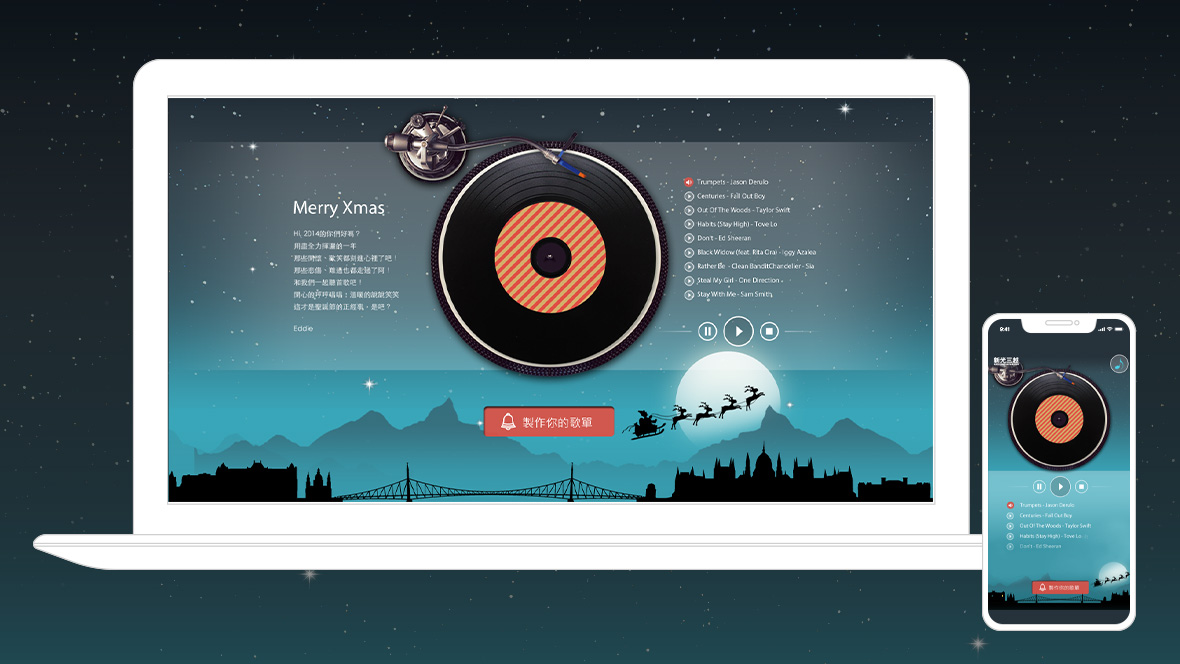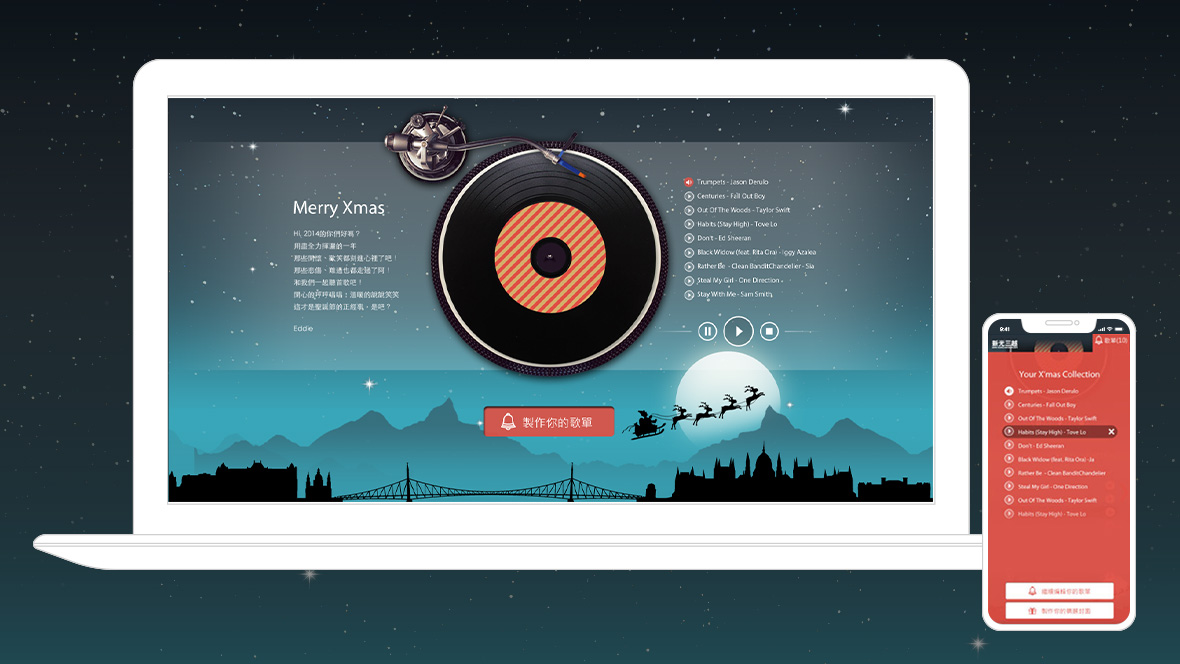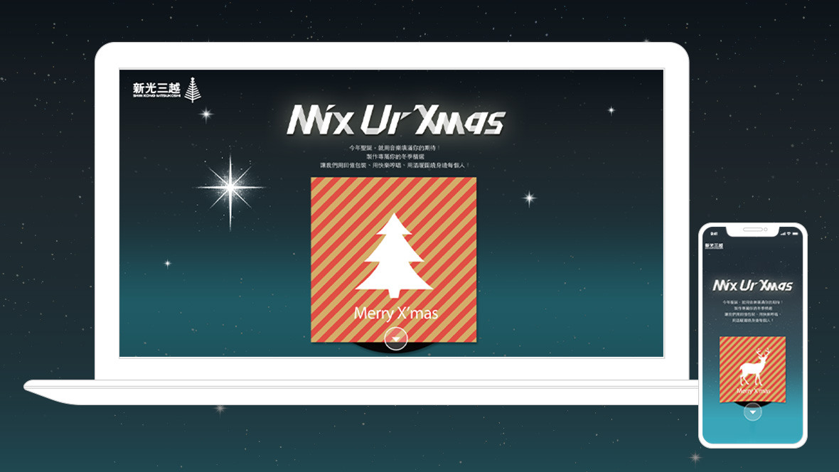 新光三越 耶誕節活動數位時代的老派浪漫精選! 翻玩Mixtape概念,用音樂填滿期待與祝福,製作專屬冬季浪漫精選,自己聆聽或是祝福親友,感受暖心氛圍! 在充滿消費意識的聖誕節中,品牌要傳達的訊息不是鼓勵消費,而是給消費者一個簡單的暖心祝福,加深品牌形象、造成自然擴散,進而增加品牌好感度。