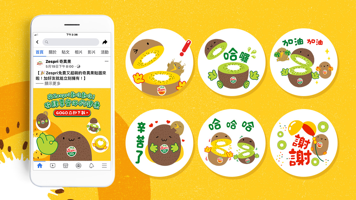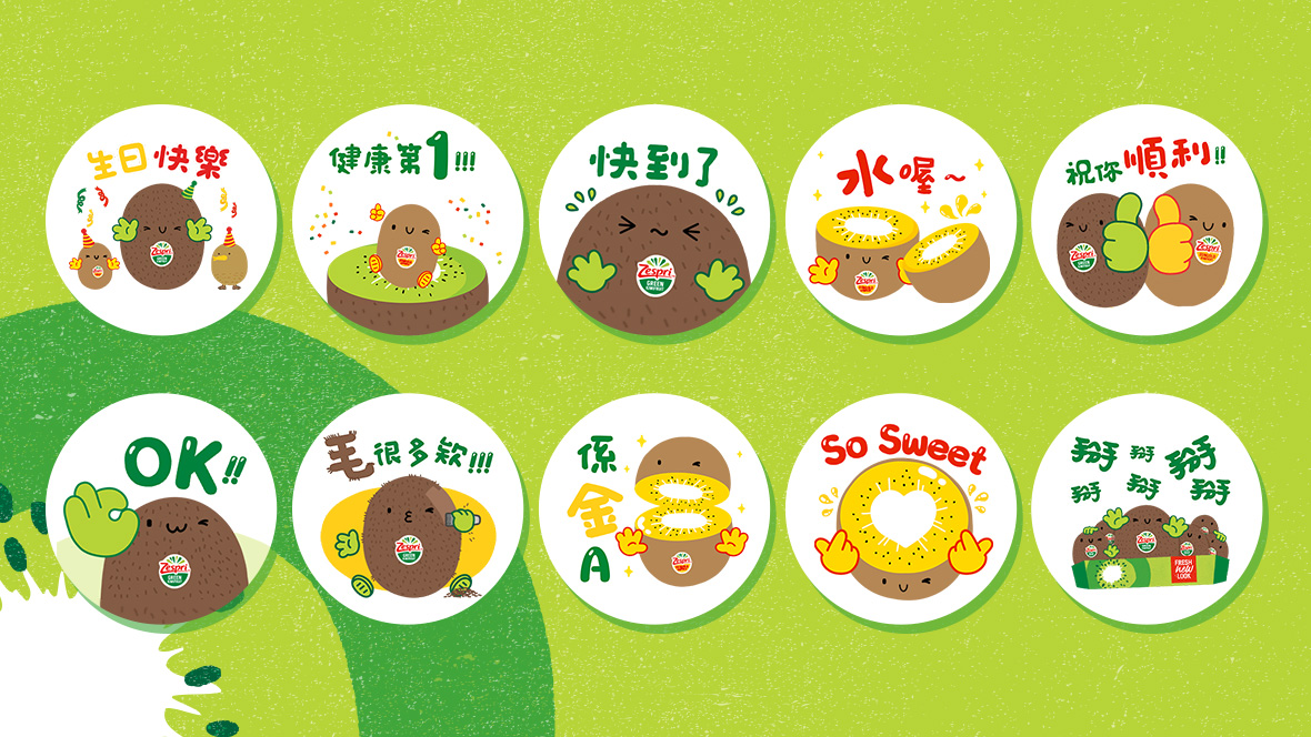 用Q萌健康的Zespri奇異果貼圖,與好友打招呼!貼圖設計理念,旨在以產品健康、熱情的特色,向消費者宣導LINE官方帳號成立及品牌標誌全新改版。 視覺上將「綠奇異果」、「陽光金圓頭」兩大產品的特徵分別清楚呈現,選用動態方式增添活潑;搭配道地口吻的招呼語,拉近品牌距離感、增加實用度,讓使用者與好友聊天時,輕鬆一按就能表達想要說的話。