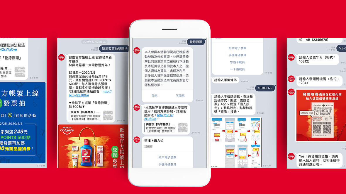 高露潔募友遊戲,農曆新年試手氣!LINE官方帳號上線期間適逢年節,為邀請新好友加入,同時與消費者祝賀新年,特舉辦「上傳消費滿額發票,參加線上抽獎」活動,利用檔期優惠配合線上互動,吸引眾多消費者玩遊戲試手氣。 考量數位化下消費者多元的支付、發票存取方式,活動採用LINE官方更新版的「發票上傳模組2.0」,使參加資格不受發票型態侷限,無論是紙本、載具、電子發票皆可參與活動。