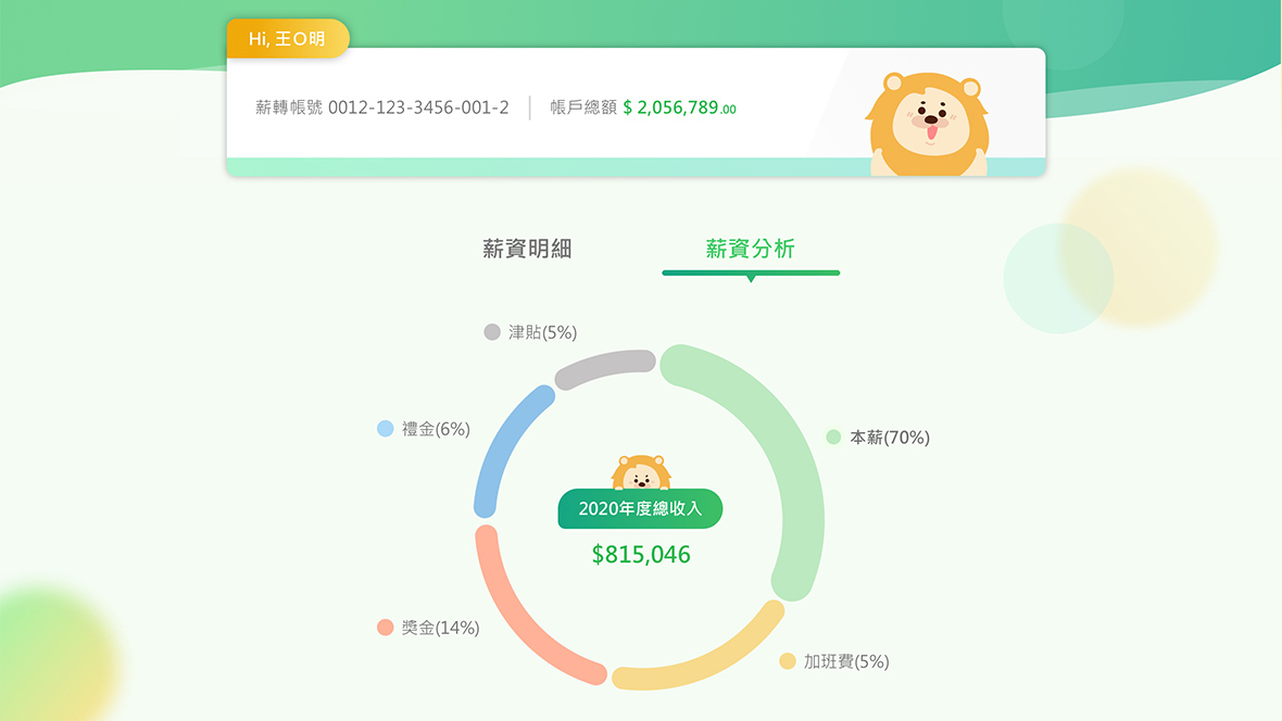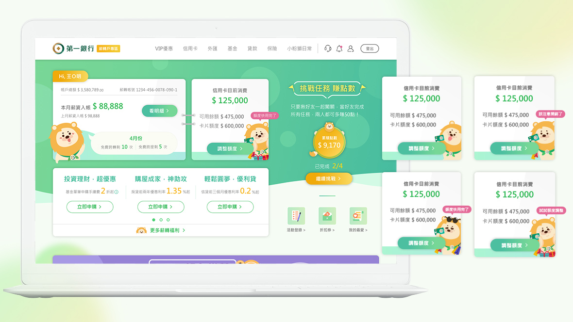 第一銀行-薪轉戶專區為薪轉客戶打造線上即時、資訊透明且個人化的薪資管理平台,以薪轉客戶理財需求為企劃核心,解決客戶其實不清楚「自己究竟享有哪些薪轉福利」的痛點,此次規劃特別將「個人化薪轉福利」清楚呈現於首頁,使客戶一目瞭然精確掌握自身權益,搭配對應的CTA按鈕,讓一銀服務完整零斷點的延伸,充分提高轉換率。此外,結合任務挑戰與獎勵機制,逐步加深客戶與一銀的互動,提升黏著度與品牌好感,任務亦可新增擴充,為將來保留更多行銷企劃操作彈性。