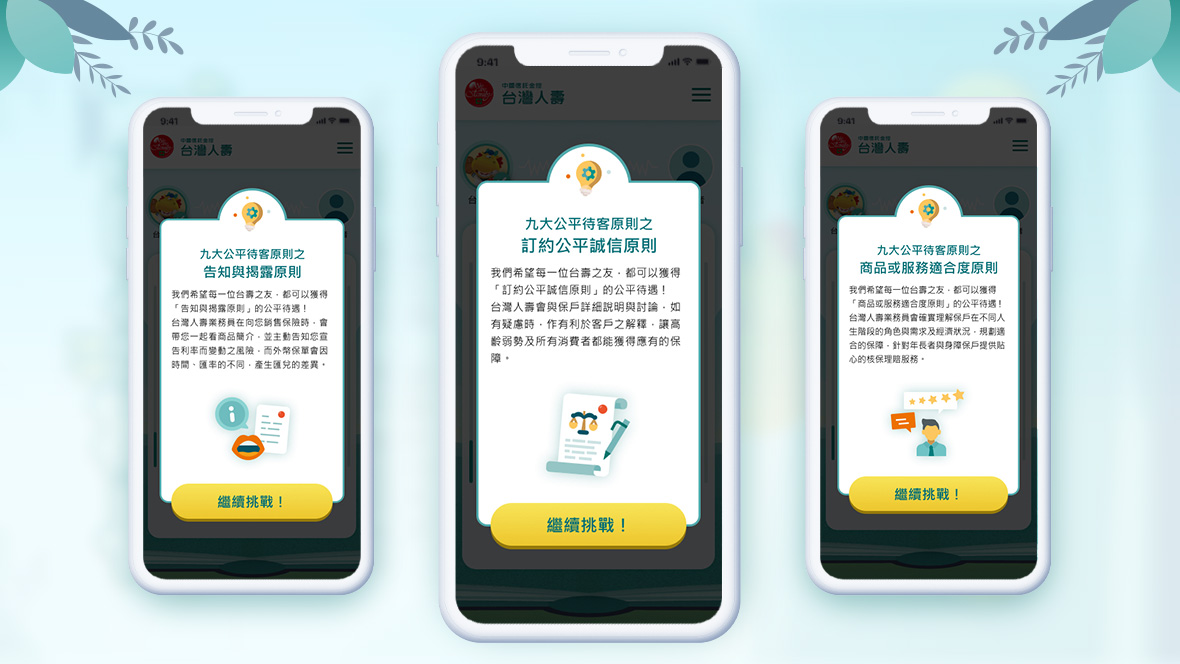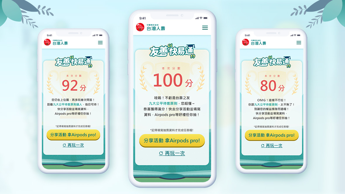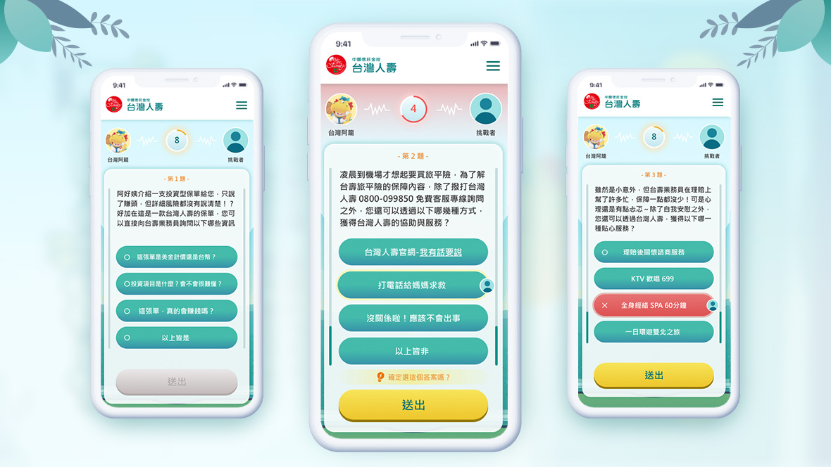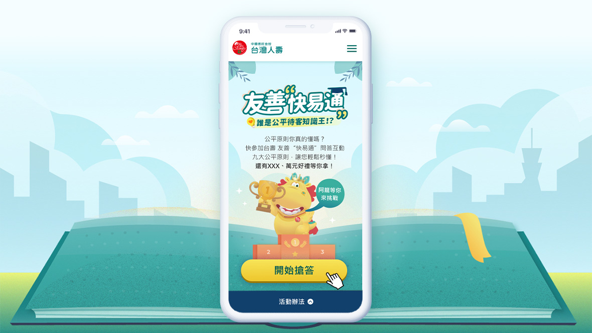 台灣人壽友善快譯通-誰是公平待客知識王為了讓消費者對生硬的「九大公平待客原則」有感,我們以QA搶答的互動方式,帶出與消費者相關的金融權益情境。並藉由台灣阿龍做為互動串場的要角,提升台灣人壽在消費者心中的好感度!問答內容,更凸顯台灣人壽許多優質服務項目;讓法規不只是法規,巧妙轉化為日常中的情境,讓消費者好吸收、好消化;權益不再睡過頭!