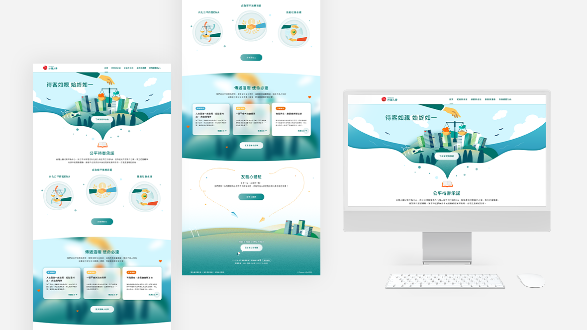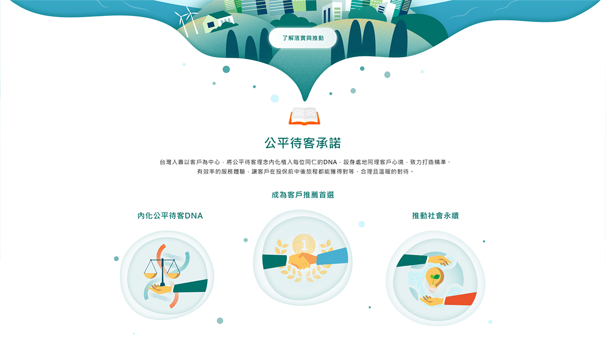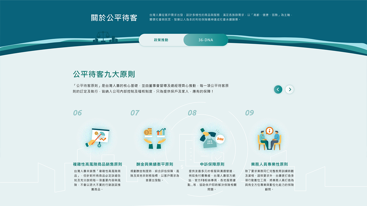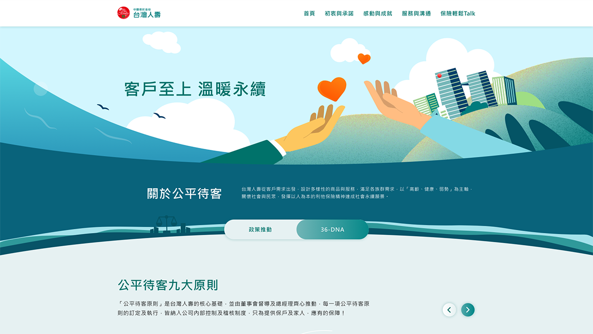 台灣人壽-公平待客原則專區為推廣公平待客承諾的主軸概念,全站佐以訂製手繪插畫風格,加入噪點筆觸增添細節質感,在內容上亦串連台壽體貼客戶的各種暖心小故事,並將難理解的 Q & A 內容以圖像說明、趣味問答、角色描述等方式呈現,使人容易閱讀;另也透過魚眼鏡頭視角在每個頁面上方加入,以象徵台壽人與客戶間緊密關係的微互動動態,傳遞企業精神與價值。