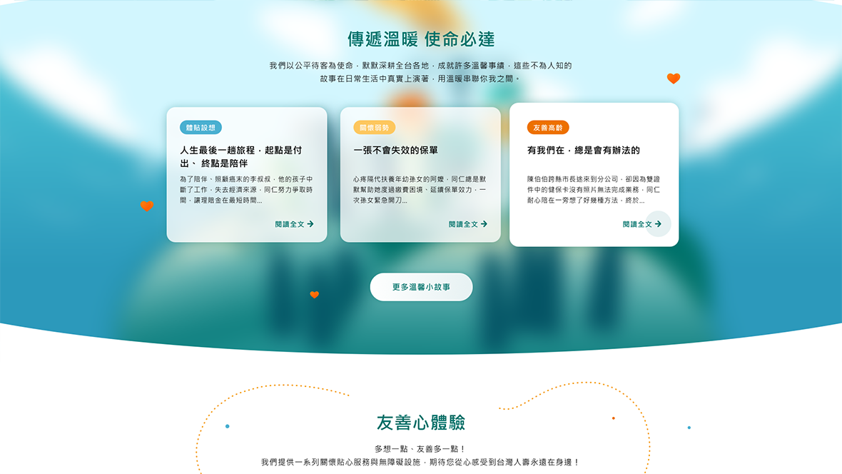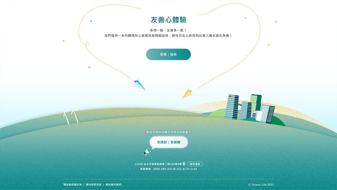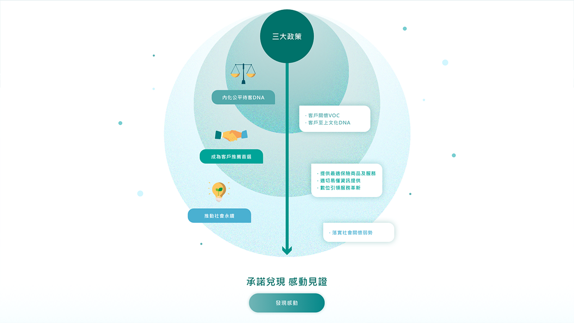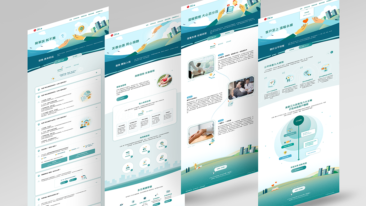 台灣人壽-公平待客原則專區為推廣公平待客承諾的主軸概念,全站佐以訂製手繪插畫風格,加入噪點筆觸增添細節質感,在內容上亦串連台壽體貼客戶的各種暖心小故事,並將難理解的 Q & A 內容以圖像說明、趣味問答、角色描述等方式呈現,使人容易閱讀;另也透過魚眼鏡頭視角在每個頁面上方加入,以象徵台壽人與客戶間緊密關係的微互動動態,傳遞企業精神與價值。